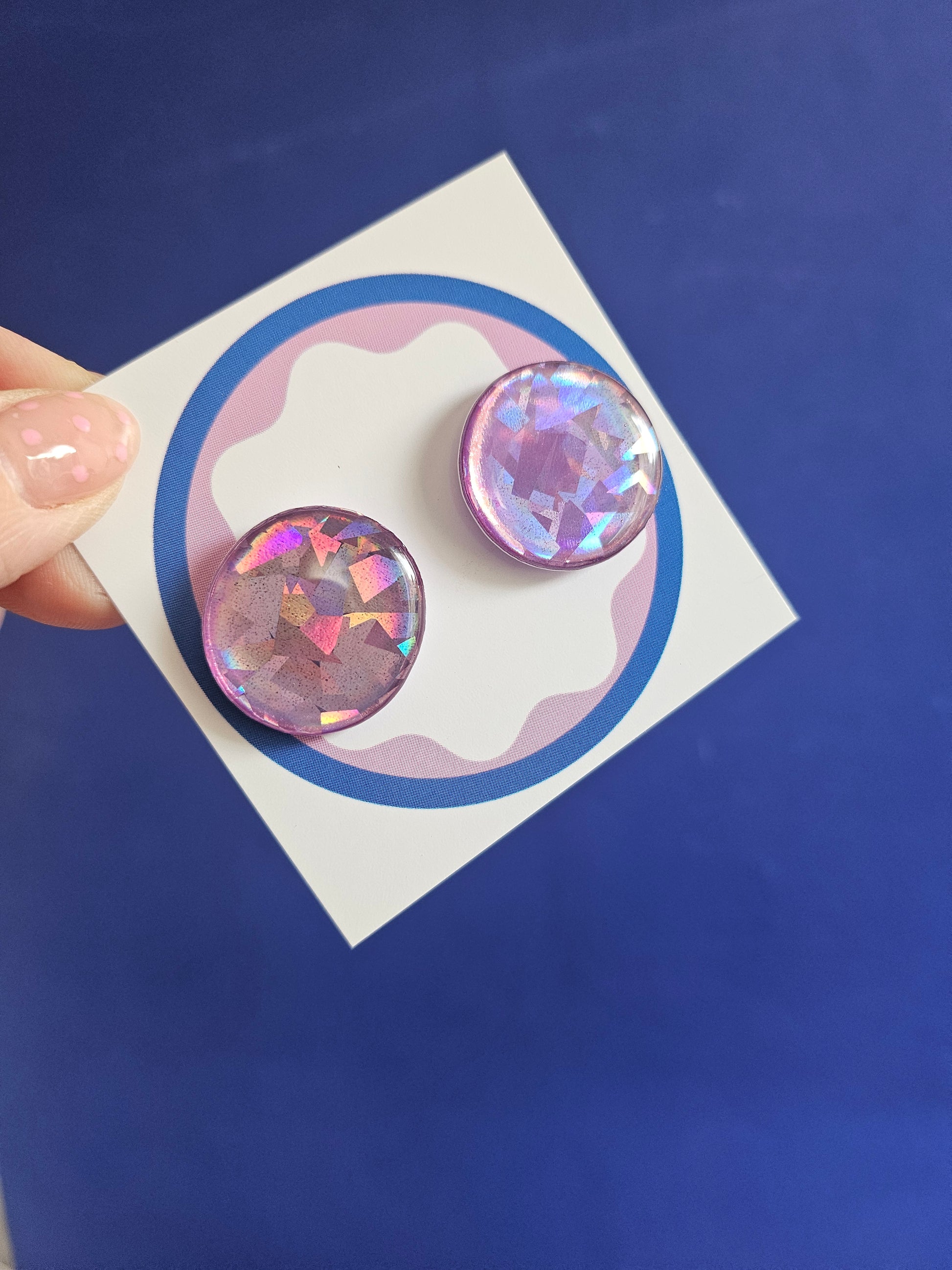 Light up your style with our Lavender Light studs! These earrings feature a holographic purple design and stainless steel backings for a trendy and durable look. Shine bright and add a pop of color to any outfit.