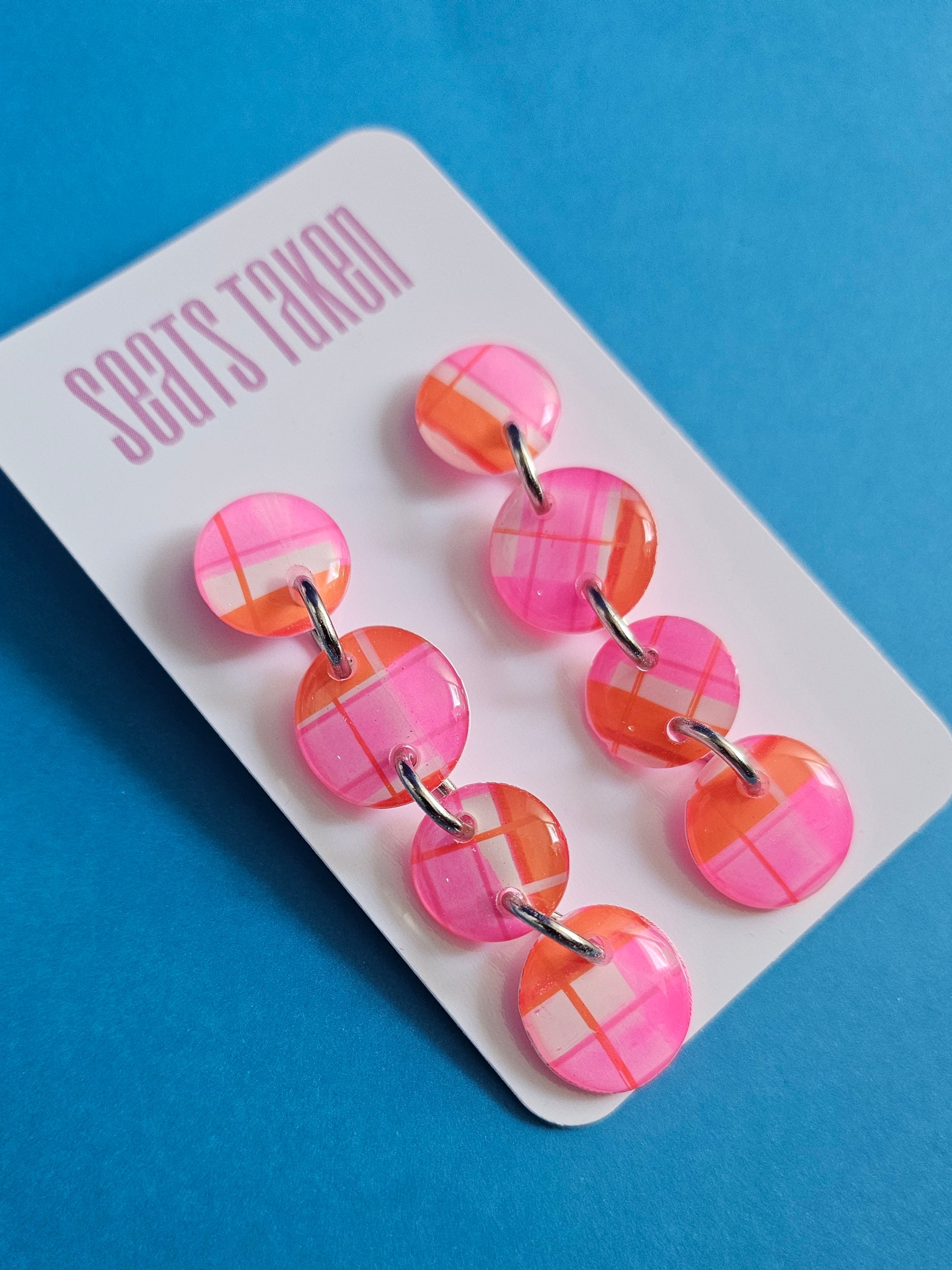"Add a touch of whimsy to your next picnic with these one-of-a-kind stainless steel backed resin earrings. Each pair is cut from a unique hand-drawn pattern, ensuring no two are alike. Perfect for the playful and quirky fashionista!"